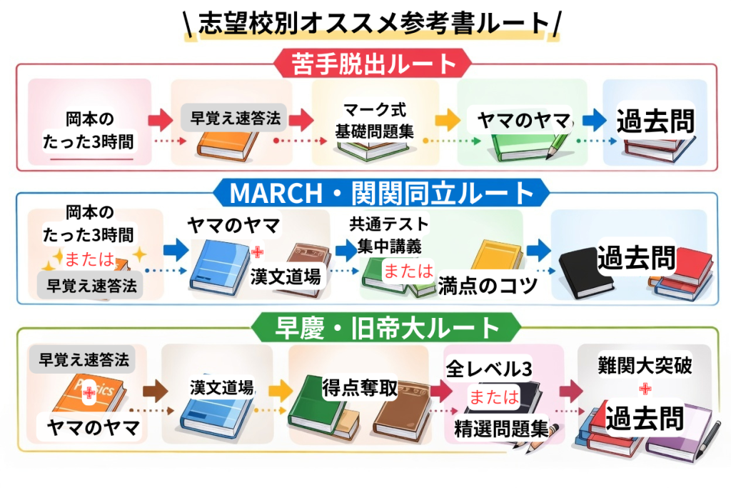 岡本のたった3時間 → 早覚え速答法 → マーク式基礎問題集 → ヤマのヤマ → 共通テスト過去問