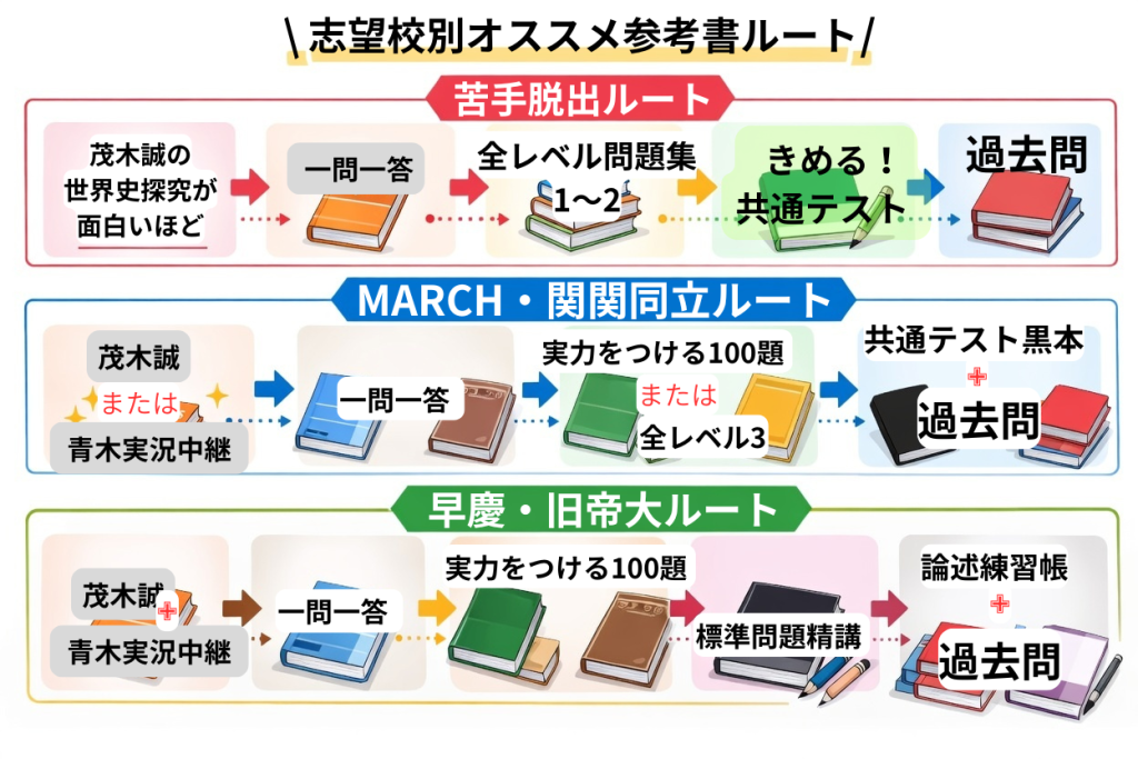 茂木誠の世界史探究が面白いほど → 一問一答必修版 → 全レベル問題集1〜2 → きめる!共通テスト → 過去問