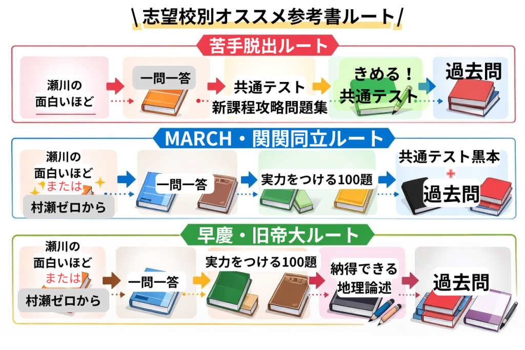 瀬川or村瀬完璧 → 一問一答完全版 → 実力をつける100題 → 過去問+地理論述