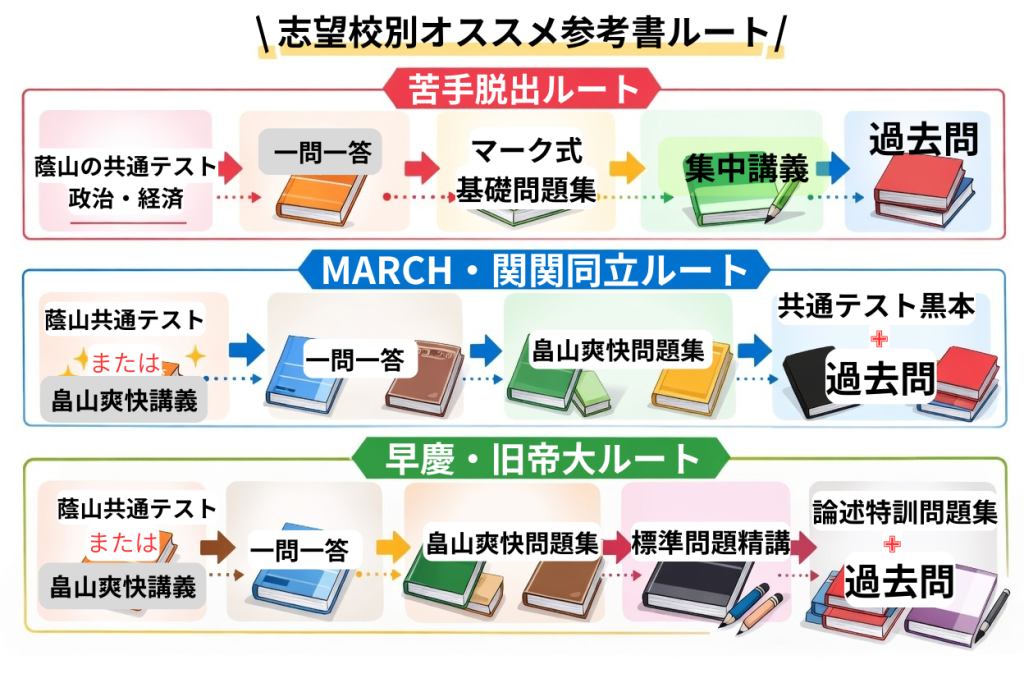 まず前のレベルで紹介した『蔭山の共通テスト政治・経済』または『畠山の爽快講義』を完璧に仕上げることが先決です。どちらの書籍もMARCHレベルまで対応できる内容が含まれているため、一冊を徹底的にやり込むことが最も効率的です。