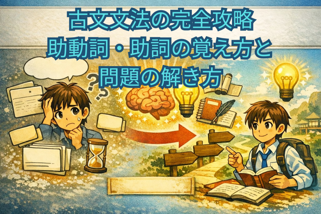 古文の文法は「暗記すれば終わり」ではありません。助動詞・助詞を識別して正しく訳すところまでが文法学習の本質です。この記事では、覚えるべき知識の整理から、試験で使える解き方の手順まで体系的に解説します。