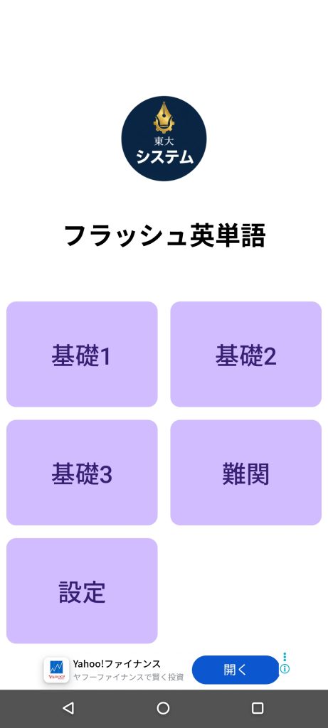 基礎レベルは日常英会話に必須の単語、難関レベルは難関大・旧帝大対策に最適です。設定では表示速度や音声のオンオフも調整可能。