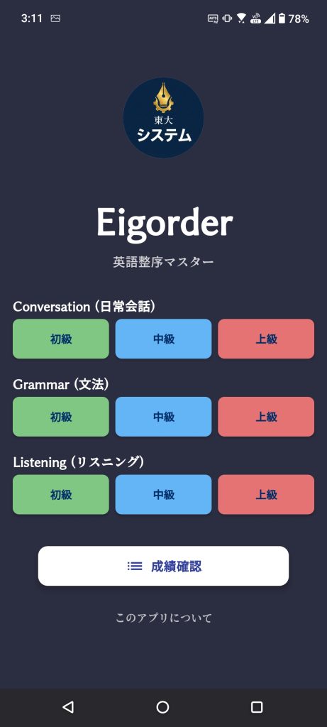 Eigorderの最大の強みは、日常会話・文法・リスニングの3分野を網羅している点です。 メニュー画面はシンプルで見やすいデザイン。