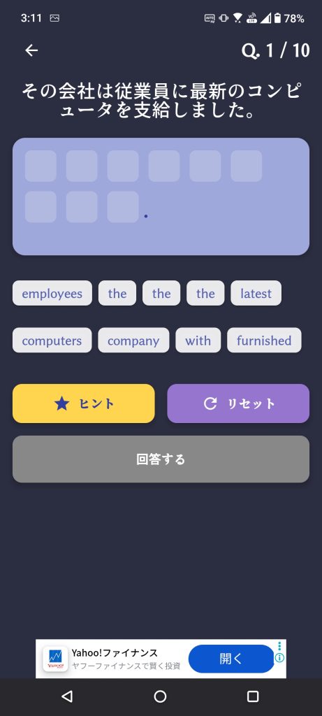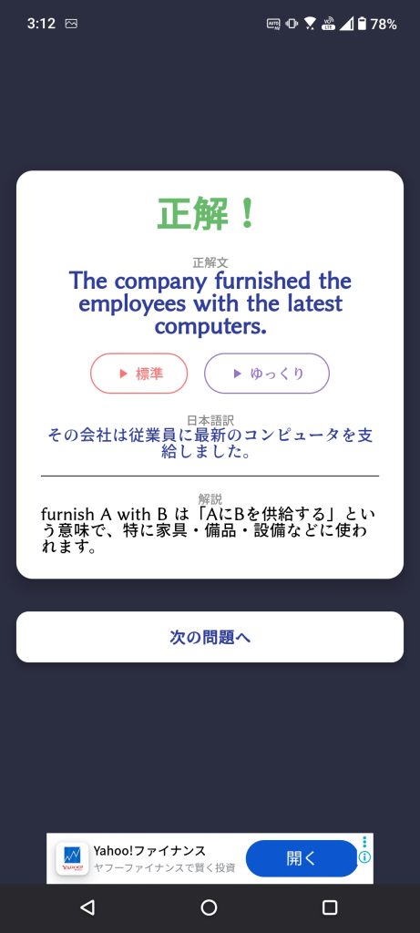 Google Playで「Eigorder」または「エイゴーダー 語句整序」で検索すればすぐ見つかります。無料で全レベル・全カテゴリ利用可。 まずはConversation初級やGrammar初級からスタートして、正解後の音声を聞きまくりましょう! 「The company furnished the employees with the latest computers.」のような文を、自分の頭でスムーズに組み立てられるようになります。